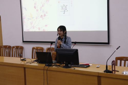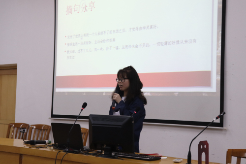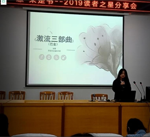 随后上台的曾慧同学,作为中文系学生以巴金的《激流三部曲》为例分享了自身读书之时、之后的读书习惯。她认为写读后感可以不受时间的束缚,只要有灵感就可以立马写下来,还提醒同学做好读书笔记,记录好出版社、作者以及出版日期。