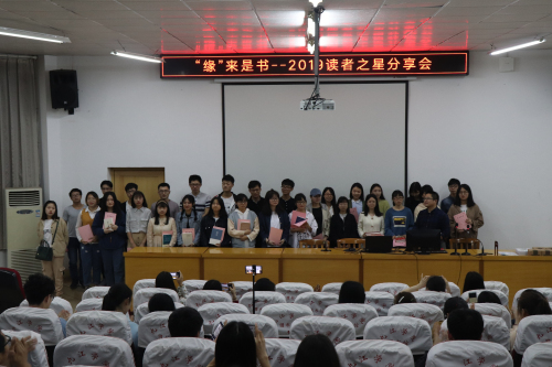 活动前,主持人简单介绍了本次分享会上台发言的六位读者之星,随后宣读读者之星获奖同学名单,图书馆阅读推广部陈勇老师、黄卫老师为获奖同学颁奖并合影留念。
