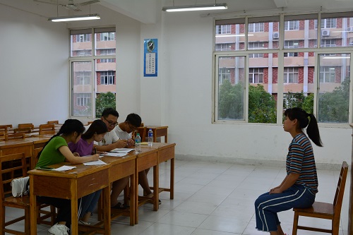每一位候选人都提前来到了217A教室进行候场,随后依次进入215A、216A教室进行正式面试。他们从容自信地介绍自己竞选助导的优势以及目的,从言谈举止中流露出对竞选助导的热情。评委在认真听完介绍后会提出适宜的问题来考察他们对军训中一些突发情况的处理能力,候选人都提出自己独特的看法并得到了老师们的认可。面试中,候选人都能在短时间内展现自己最优秀的一面,从中表达自己当助导的决心及对助导工作的理解。