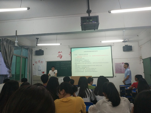 同学们认真、耐心听取资助委员的演讲,学习相关的国家资助政策,了解生源地助学贷款违约后果等。