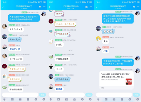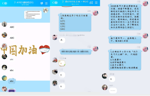 本次活动各班级大多以直播的方式进行。活动开始由团支书播放PPT或新闻资料并讲述此次疫情的情况与影响,还播放了预防新冠肺炎相关知识的视频和此次疫情相关的励志视频。观看结束后,由团支书组织大家讨论并思考在疫情期间如何尽自己的力量帮助防控疫情。在活动过程中,也加入了提问环节,同学们通过在班级群发消息进行抢答发言。活动最后由各班级团支书播放团歌MV,大家各自闭麦跟唱。